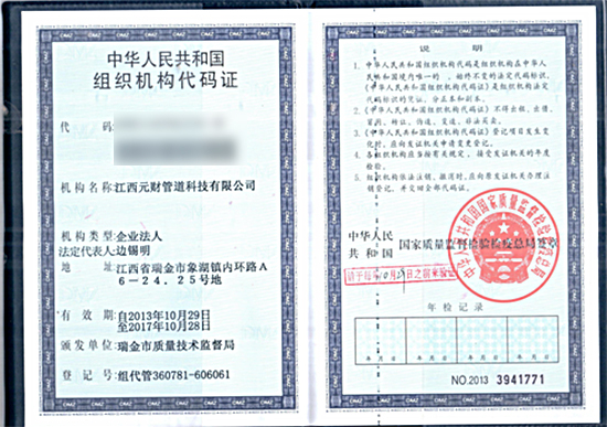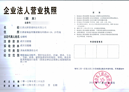 在集团各位领导、工监会及公司各部门的悉心关怀与大力支持下,经过四个月的前期筹备,江西元财管道科技有限公司已于2013年10月30日正式完成了工商注册手续。