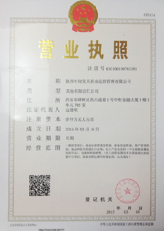 hth官方网页入口讯 在hth官方网页入口集团领导的大力支持和精心指导下,陕西hth官方网页入口昊天商业运营管理有限公司于2015年3月16日完成工商登记,西安市工商局正式颁发营业执照。